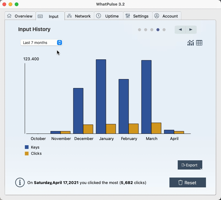 NEW Add a table view on the Input History tab. Here you can list key and click counts grouped by hour, day, week, month, or year. Input history is a Premium feature.