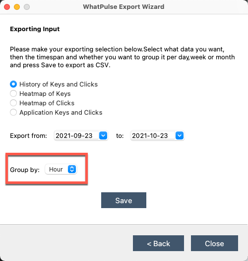 And on popular demand, the Export Wizard can now group by the hour for input and application uptime. The resulting CSV file has your data split by the hour. Want a CSV with the number of keys of last week between 8:00 and 8:59? Done.