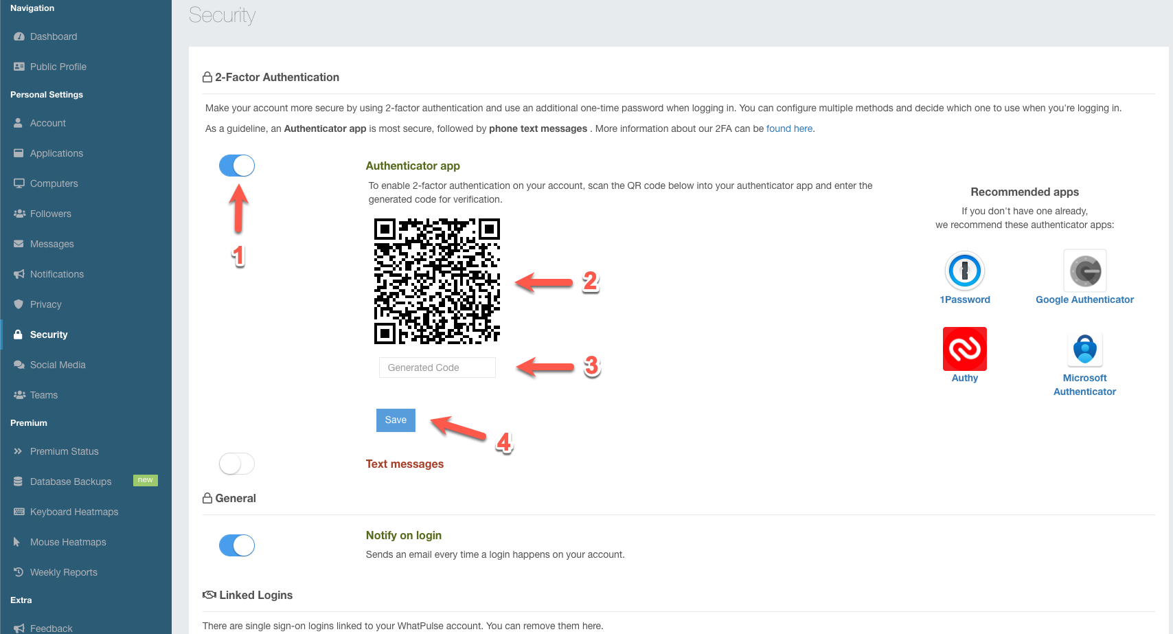 Adding extra security to your WhatPulse account can be achieved using our 2-Factor Authentication (2FA) implementation. We use a Time-based One-Time Password (or TOTP) method, which means you can receive a code via an authenticator app to prove that it's actually you that's trying to log in.